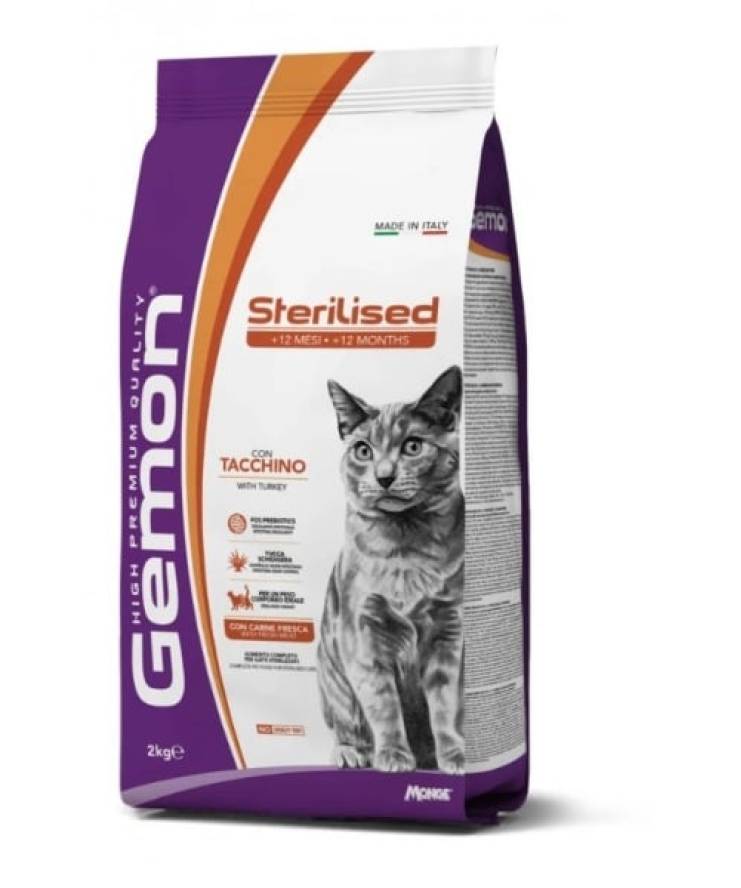 Gemon Sterilised Cat oferă un profil nutrițional complet, având un conținut ridicat de carne proaspătă de curcan, care asigură o sursă excelentă de proteine de calitate superioară. De asemenea, formula sa conține prebiotice – F.O.S. și M.O.S. – care susțin sănătatea digestivă și ajută la menținerea unei flore intestinale echilibrate. Acizi grași Omega 3 și Omega 6 esențiali contribuie la sănătatea pielii și a blănii, iar nivelul de fosfor și magneziu este reglat pentru a sprijini sănătatea renală.